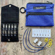 - Also included is a secure tip sleeve, three [S] diameter blue X-Flex cables (5″/13cm, 6″/15cm & 8″/20cm), end stoppers, tightening keys, connectors, stitch markers and a mini needle gauge all in a blue, pocket-sized nylon fabric pouch.