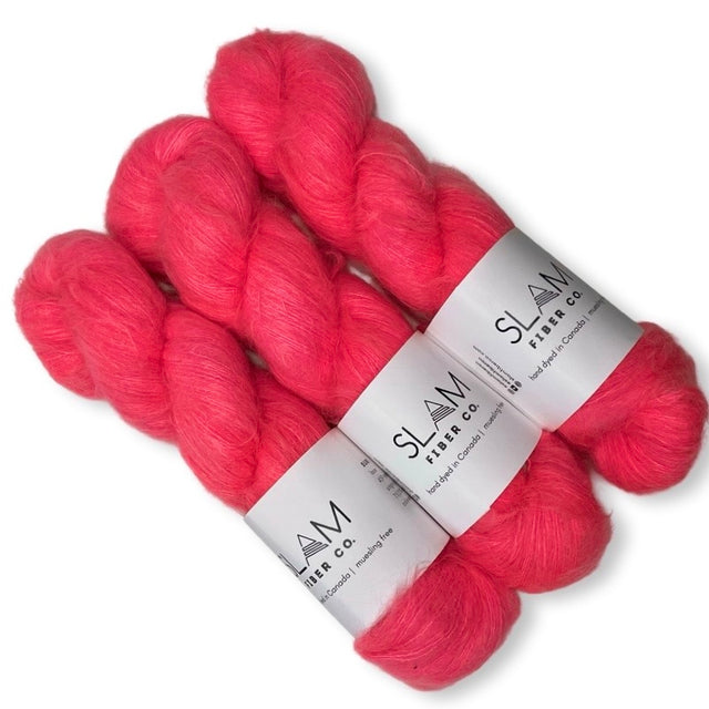 Slam Fibre Co. Suri is an incredibly soft, lace weight yarn that works up beautifully on a wide range of knitting projects. Hold it together with your favorite yarn to create a soft halo.  Suri is a great alternative to mohair if you find it itchy.  Suri alpaca is often compared to the softness of cashmere!  This ethically sourced, mulesing free, suri alpaca and mulberry silk yarn is hand dyed in Alberta, Canada and its beautiful halo makes it a dream to knit with. Enjoy the luxurious feel and gorgeous colors of this yarn while knitting something exquisite.