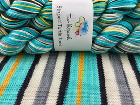 Turtlepurl Yarns Striped Turtle Toes sock yarn is a beautiful sock yarn to work with. This high twist, 4 ply sock yarn is durable, smooth and incredibly soft. A blend of superwash merino and nylon creates a soft and gorgeous fabric.