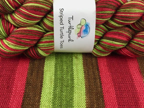 Turtlepurl Yarns Striped Turtle Toes sock yarn is a beautiful sock yarn to work with. This high twist, 4 ply sock yarn is durable, smooth and incredibly soft. A blend of superwash merino and nylon creates a soft and gorgeous fabric.
