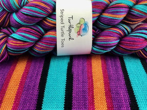 Turtlepurl Yarns Striped Turtle Toes sock yarn is a beautiful sock yarn to work with. This high twist, 4 ply sock yarn is durable, smooth and incredibly soft. A blend of superwash merino and nylon creates a soft and gorgeous fabric.