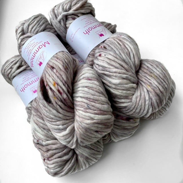 Baah Yarn Mammoth is a beautiful super bulky yarn made from 100% superwash, single ply, merino wool. Each skein of yarn is carefully hand painted in studio in Las Vegas, Nevada. The colors are spectacular and the quality is unmatched. Mammoth is truly a dream to work with.