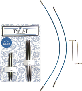 TWIST Short Combo packs contain one 2″ (5 cm) and one 3″ (8 cm) set of the same size tip as well as two cables allowing knitters to make 9″ (23 cm) – 12″ (31 cm) circulars.