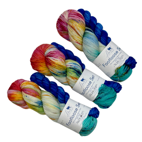 The Footloose Sock Set includes one full 100g/460y and one mini 20g/90yd skein which are machine washable (gentle cycle, cold water, do not tumble, dry flat) Baah Yarn Footloose sock yarn is a 25% nylon/75% 4-ply, merino wool blend, milled in Peru then artisanal hand dyed, in Las Vegas, Nevada.