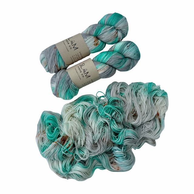Slam Fibre Co. Sock fingering weight yarn is an incredibly soft, 4-ply yarn that works up beautifully on a wide range of knitting projects but especially socks!  A fingering weight, 437 yard skein, this ethically sourced, mulesing free, merino and nylon blend is hand dyed in Alberta, Canada.  Spun from 19.5 micron fibres, it is an absolute dream to knit with and to wear. Enjoy the luxurious feel and gorgeous colors of this yarn while knitting your favourite patterns!