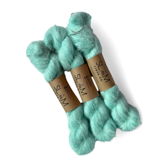 Slam Fibre Co. Suri is an incredibly soft, lace weight yarn that works up beautifully on a wide range of knitting projects. Hold it together with your favorite yarn to create a soft halo.  Suri is a great alternative to mohair if you find it itchy.  Suri alpaca is often compared to the softness of cashmere!  This ethically sourced, mulesing free, suri alpaca and mulberry silk yarn is hand dyed in Alberta, Canada and its beautiful halo makes it a dream to knit with. Enjoy the luxurious feel and gorgeous colors of this yarn while knitting something exquisite.