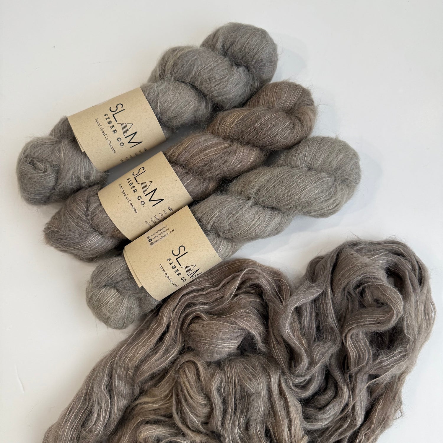 Slam Fibre Co. Suri is an incredibly soft, lace weight yarn that works up beautifully on a wide range of knitting projects. Hold it together with your favorite yarn to create a soft halo.  Suri is a great alternative to mohair if you find it itchy.  Suri alpaca is often compared to the softness of cashmere!  This ethically sourced, mulesing free, suri alpaca and mulberry silk yarn is hand dyed in Alberta, Canada and its beautiful halo makes it a dream to knit with. Enjoy the luxurious feel and gorgeous colors of this yarn while knitting something exquisite.